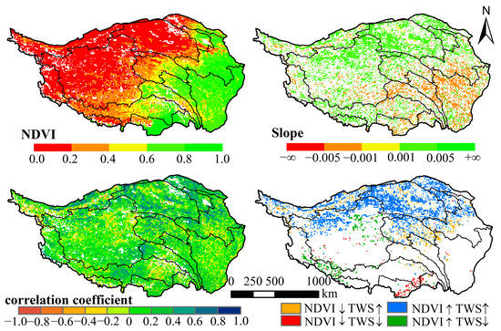 Vegetation is an important component of terrestrial ecosystems and is a bond of connecting various elements such as the atmosphere, soil, and hydrology. Water resources are a decisively driving factor of vegetation dynamics; about 61% of global vegetation cover is primarily controlled by water conditions [66], on the other hand, spatiotemporal variations in vegetation also can also cause changes in parameters, affecting the balances of surface energy and the water cycle. Precipitation is a common indicator to investigate how the water conditions influence vegetation. Previous studies have investigated the responses of vegetation to water conditions, mainly relying on the surficial and indirect information from precipitation [66,67,68]; the influences of terrestrial water storage on vegetation have been gradually explored in recent years. The satellite-based normalized difference vegetation index (NDVI) could indicate the growth, spatial distribution, and change trend of vegetation. The relationship of NDVI with terrestrial water storage showed the water conservation capacity of vegetation over the Tibetan Plateau during the period 1981–2015 (Figure 12), where the blank areas did not pass the 95% significance test. The NDVI over the western Tibetan Plateau showed the characteristics of low and increasing values; on the other hand, the eastern Plateau was high but showed decreasing values. The positive correlation was relatively strong between NDVI and terrestrial water storage in the Qinghai Lake region (0.62 **), the inland river region (0.49 **), the Qaidam Basin (0.46 **), and the Yellow River source region (0.41 **). Moreover, both the NDVI and terrestrial water storage presented a significantly increasing trend in the north, accounting for about 13.20% of the plateau, indicating that the water conservation capacity has been improved to a certain extent during the process of the continuous improvement of vegetation in the north. In the source regions, NDVI and terrestrial water storage were mainly in an inverse relationship, whereas in the Yangtze River, Yellow River, and Lancang River source regions, the NDVI has decreased and terrestrial water storage has increased in recent years. While in the Indus River and Yarlung Zangbo River source regions, the NDVI increased while terrestrial water storage decreased. The increase in the NDVI leads to a greater rise in water consumption for vegetation growth and then a decline in terrestrial water storage probably due to the high altitude where the source areas are located. The vegetation growth in the southeast, especially the tropical monsoon climate zone around the Yarlung Zangbo River Grand Canyon and the Himalayas, was generally good but has had a certain degradation trend in recent years, and terrestrial water storage has also declined to a certain extent.
