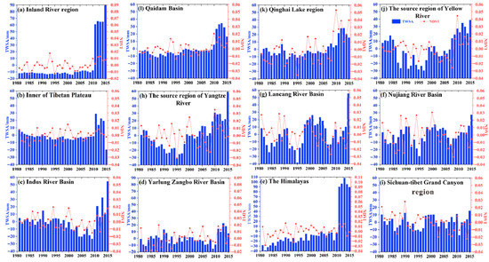 Temporal trend in terrestrial water storage anomaly and NDVI for each sub-region over the Tibetan Plateau during the period 1981–2015.