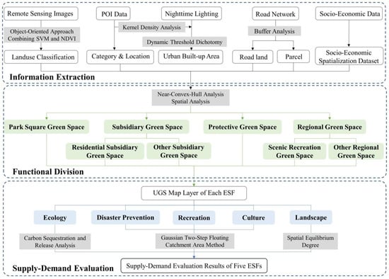 This study established a detailed workflow for evaluating the ESF supply–demand status of UGS (Figure 1). The workflow mainly included three parts: information extraction, functional division and supply–demand evaluation.