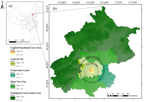 Beijing is located in the northern part of the North China Plain of China [], as shown in Figure 2a. In the documents officially released by Beijing [,,], five functional areas and two park rings are planned for the construction of UGS (Figure 2b).