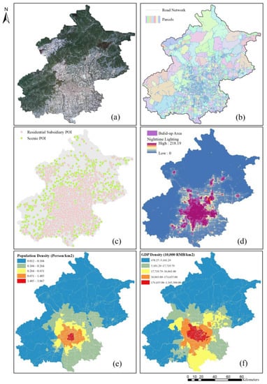 Pre-processed remote sensing image (a), road network and parcels (b), POI distribution (c), nighttime lighting and urban built-up area (d), population density of each parcel (e), GDP density of each parcel (f) in the study area.