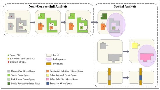 In the second part, by fusing the information of multi-source data, six functional types of UGS were classified, including park square green space, residential green space, other subsidiary green space, protective green space, scenic recreation green space, and other regional green space. Near-convex-hull analysis was used to distinguish scenic green space and residential green space. Then, park square green space and scenic recreation green space were separated from scenic green space; other regional green space and other subsidiary green space were separated from other green space; overlay UGS and road land to extract protective green space.