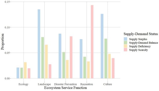 Compared with the other four ESFs, the supply scarcity areas of recreation accounted for the largest proportion, 14.31%. Due to the high population density and the small number of UGS in the city center, it was not easy to meet the demand for recreation of the large urban population. However, around the large parks and squares within the fifth ring, such as Olympic Forest Park, Tiantan Park, and Chaoyang Park, there were still areas with supply–demand balance or even supply surplus, indicating that the large green space patches in urban centers were very useful in relieving a large amount of recreation demand of urban residents. Rural areas in the suburb also had several supply scarcity areas, indicating that the construction of park square green spaces and residential subsidiary green spaces in rural areas was not enough to fully meet the needs of residents’ recreation.