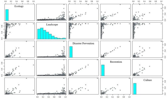 Although there are many studies on evaluating EFS of UGS, it is common to recognize UGS as undifferentiated for relevant research. However, it is undeniable that different functional types of UGS play different roles in ES, which is a blank area of research so far. As the scatter parcel (Figure 9) shows, there was no significant two-by-two correlation between the five functions, indicating that the same parcel of UGS had different degrees of influence in different ESFs. For example, the protective green space on both sides of the road could not assume the same recreation function as the park square green space; scenic recreation green spaces in the suburb do not provide short-distance recreation service for residents living in the urban center; and so on. In this study, the ESFs undertaken by different green space patches were separately determined by using the functional characteristics of UGS. Therefore, a different ES supply–demand situation of UGS was obtained from a new perspective.
