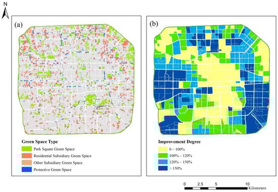 We specifically explored how much change would be brought to the supply–demand situation if we change the functional type or increase the ESF of existing UGS without changing the existing area. Taking the culture function as an example, it can be seen that almost all UGS within the fourth ring were in a state of supply scarcity (Figure 7e), and there were a large number of subsidiary green spaces which could not provide culture function (Figure 10a). Assuming that these UGS have the same culture service function as the park square green space, we calculated the improvement degree in the supply–demand situation within the fourth ring. A total of 31.84% of the areas had an improvement in the culture service situation within 100%, 19.95% had an improvement of 100–120%, 19.25% had an improvement of 120–150%, and 28.97% had an improvement of more than 150% (Figure 10b). It fully indicates that when the construction area of UGS in the urban center is limited, increasing the high-quality of UGS [] can greatly improve the ESF supply–demand status.