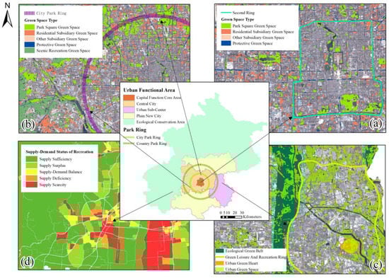Typical areas in construction of UGS: the capital functional core area (a), partial region of the central city and the urban park ring (b), partial region of the urban sub-center (c), partial region of ecological conservation area (d).