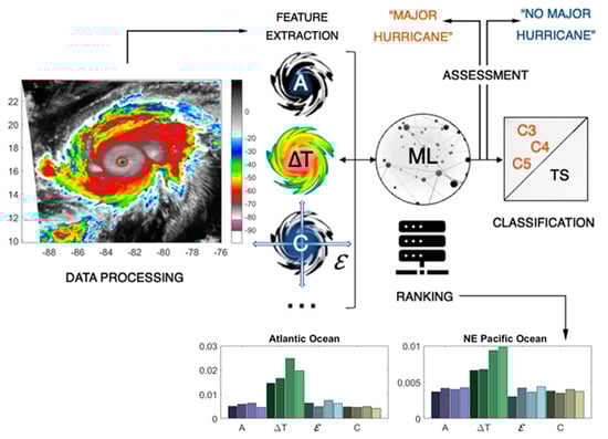 With rising global temperatures, it is more difficult to gauge complex ocean and atmospheric interactions, and hence the potential of a tropical cyclone (TC) to become much stronger in the short term [1,2,3,4]. It has been long disputed whether there is a positive trend in intensity-related studies given the limited quality and temporal length of the data (e.g., [5]). However, it is becoming increasingly apparent in the literature that a variety of TC properties have changed over the past 40 years [2]. Moreover, there are particularities regarding both the shape and levels of strength, depending on the region where they form (e.g., [2]). Hurricanes are strong TCs that occur in the Atlantic or northeastern (NE) Pacific oceans and behave differently than other types of storms. In the face of this complexity, it is a challenging task to disentangle which hurricane-related parameters or combinations of parameters and pre-existing factors are fundamental in the hurricane’s growth. Advanced methods should hence be set up to reflect this complexity to improve early prediction and enhanced decision-making [6]. A wider comprehension of the most robust hurricane features and precursors to the formation of a hurricane could certainly help us to be better prepared for future destructive storms. Without a doubt, the impact of an intensified hurricane can cause catastrophic damage not only to coastlines, but also hundreds of miles inland in terms of regional economic impacts and human losses [7].