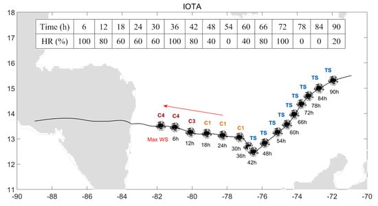 Analysis of the hit ratio (HR) for the different prediction models for hurricane Iota (Atlantic Ocean, 13–18 November 2018). The image shows the track of the TC under consideration for each lead time since the TS was formed (13 November 2020, at 21:00 UTC) until it reached its maximum intensity peak, or wind speed (Max WS) (16 November 2020, at 12:00 UTC). The arrow indicates the rapid increase in scale category as the TC progressed. The table shows the hit ratio (the number of times that a correct prediction was made out of the total number of predictions) of our RF classifier for each lead time (as in Table 1, Table 2 and Table 3). TS and C1-5 stand for tropical storm and category 1–5 hurricanes, respectively.