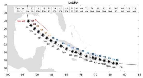 As in Figure 4, but for hurricane Laura (Atlantic Ocean, 20–29 August 2020). Here, the TS was formed on 21 August 2020, at 09:00 UTC and it reached the Max WS on 27 August 2020, at 00:00 UTC.