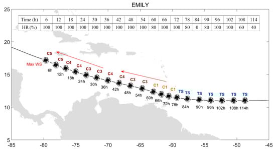 As in Figure 4, but for hurricane Emily (Atlantic Ocean, 11–21 July 2005). Here, the TS was formed on 12 July 2005, at 00:00 UTC and it reached the Max WS on 17 July 2005, at 00:00 UTC.