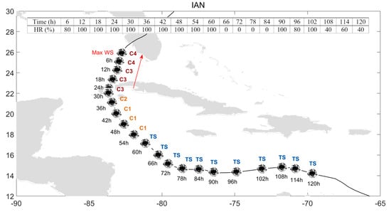 As in Figure 4, but for hurricane Ian (NE Atlantic Ocean, 19 September–2 October 2022). Here, the TS was formed on 19 September 2022, at 12:00 UTC and it reached the Max WS on 28 September 2022, at 12:00 UTC.