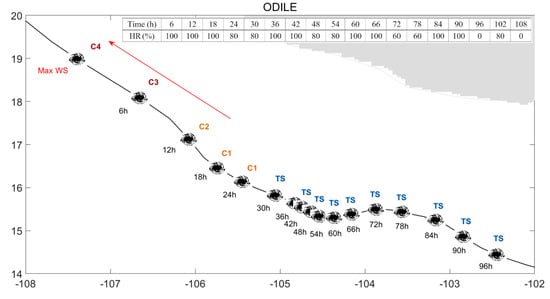 As in Figure 4, but for hurricane Odile (NE Pacific Ocean, 10–18 September 2014). Here, the TS was formed on 10 September 2014, at 06:00 UTC and it reached the Max WS on 14 September 2018, at 06:00 UTC.