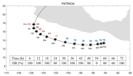 As in Figure 4, but for hurricane Patricia (NE Pacific Ocean, 20–24 October 2015). Here, the TS was formed on 21 October 2015, at 00:00 UTC and it reached the Max WS on 23 October 2015, at 12:00 UTC.