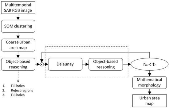 In this paper, we exploit multitemporal SAR composites as defined in [29,30] to introduce a novel method for mapping urban areas. It exploits multitemporal SAR red-green-blue (RGB) composites clustered using a self-organizing map algorithm to generate a coarse pre-classification map, which is refined through object-based reasoning in a loop.