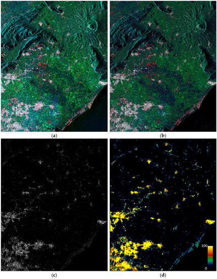 The rationale of these products is briefly recalled here for the ease of the reader. Level-1α images (see Figure 2a as an example) are bi-temporal oriented to change detection. They are built by using a reference image for changes evaluation and a test one, usually loaded on the blue and green channels, respectively. The red band is reserved to the interferometric coherence. This composition makes buildings appear in the color white due to their high response to all the channels involved in the composition [29].