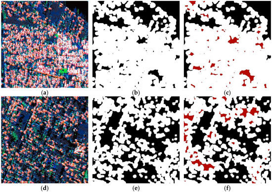 Object-based reasoning for filling the “holes” within the identified urban area. Dense urban area: (a) clustered Level-1α product, (b) coarse urban area map, and (c) holes (in red color) filled by analyzing the spatial relationship between neighboring objects. Sparse urban area: (d) clustered Level-1α product, (e) coarse urban area map, and (f) holes (in red color) filled by analyzing the spatial relationship between neighboring objects. Holes filled at this stage are marked with the numeric ID 1, indicating a “low density” urban area.