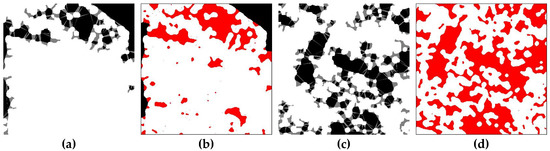Delaunay triangulation OBIA. Dense urban area: (a) bridges between close regions, and (b) connected regions absorbed in the urban area displayed in the color red. Sparse urban area: (c) bridges between close regions, and (d) connected regions absorbed in the urban area displayed in the color red.