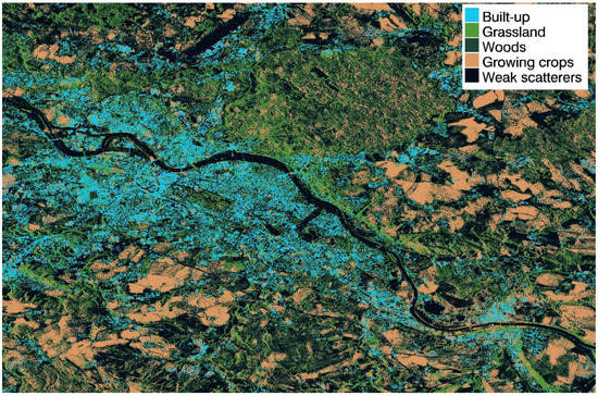 The workflow discussed above has been applied to two structurally different scenes, represented by two different input RGB products. The first scene concerns an area located in the north of the city of Napoli (Italy). In this case, the input product is the Level-1α product [29] depicted in Figure 2a. The second scene concerns the city of Dresden (Germany). In this case, the input product is a Level-1β product [30] derived from Sentinel-1 data. Its 5-class clustering is depicted in Figure 5. Both of the images have been resampled through spatial multilooking up to a 15 m resolution.