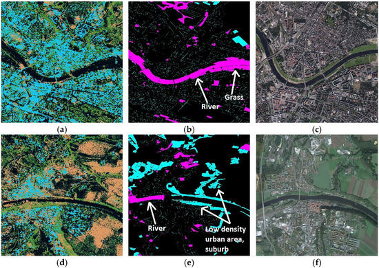 The river is incorrectly classified as an urban area, as well as the adjacent grassland stripe. However, this classification is congruent with the given definition of urban area. With the river being completely surrounded by a dense urban agglomerate, it is reasonable to consider this feature as a part of it. This is a typical example of “false urban” classifications with respect to the Urban Atlas. In Figure 8d–f, the focus is on the “missed urban” areas. In particular, in Figure 8d, a portion of the Elbe River in the suburbs of Dresden is shown. The classification error map is reported in Figure 8e. Finally, the corresponding Google Earth view is depicted in Figure 8f.