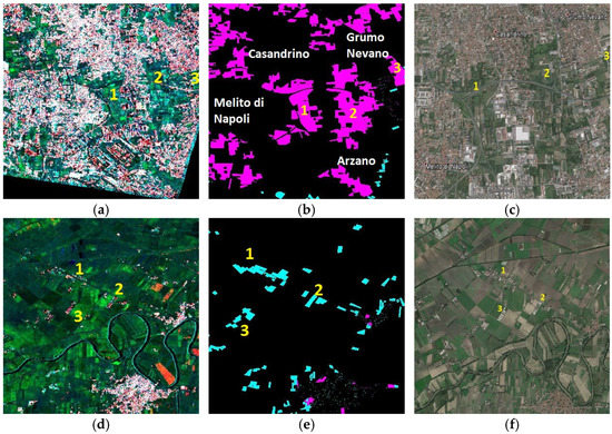 Napoli and Caserta areas, misclassification sources. (a) An agricultural area as seen on the Level-1α image. (b) Misclassification map. (c) Google Earth view. (d) A small urban area surrounded by a rural landscape as seen on the Level-1α image. (e) Misclassification map. (f) Google Earth view.