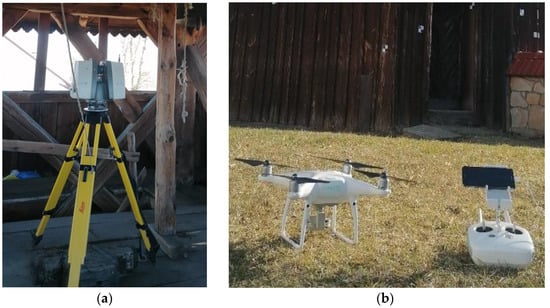 Figure 2. Measuring equipment (a) Leica ScanStation P40; (b) DJI Phantom 4 Pro with mounted digital camera. - Unmanned Aerial Vehicle: DJI Phantom 4 Pro (Figure 2b) with a mounted digital camera with a 1-inch 20Mpx CMOS sensor,