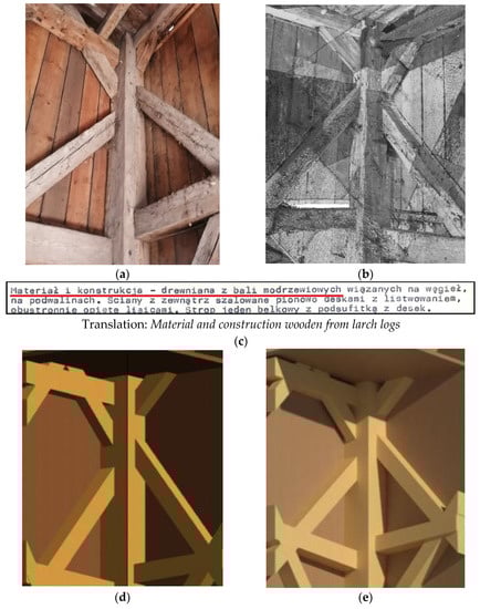 The descriptive documentation contained in the Monument’s Charter made it possible to determine the features of the object (origin, construction period, any changes, renovations and renovations carried out over the centuries), identification of the materials from which the structure of the object was made (often invisible on the point cloud due to the use of formwork for walls and ceilings), the structural system of the roof truss beams (Figure 9).