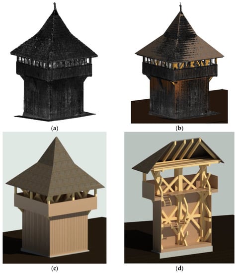 Work results for the belfry: (a) comprehensive point cloud with TLS-UAV integration; (b) generated model based on a point cloud; (c) visualization of the HBIM model; (d) visualization of the cross-section (interior) of the building.