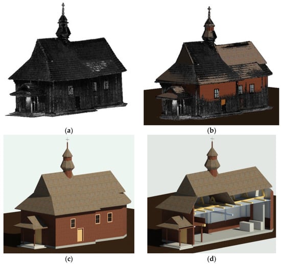 Work results for the chapel: (a) comprehensive point cloud with TLS-UAV integration; (b) generated model based on a point cloud; (c) visualization of the HBIM model; (d) visualization of the cross-section (interior) of the building.