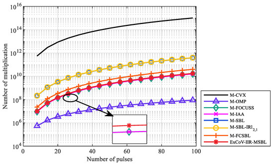 For a more intuitive comparison of the above-mentioned algorithms, we plot Figure 3, illustrating the relationship between the number of complex multiplications and the number of pulses. We assume that , , , and is set to be the rank of clutter. It can be seen from Figure 3 that the M-SBL-IR has nearly the same computational load as M-SBL, and the proposed algorithm has the lowest computational complexity among these compared SBL based algorithms and is close to the M-IAA and M-FOCUSS algorithms.