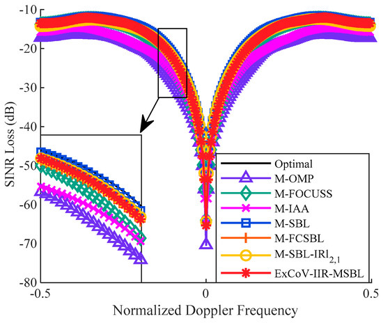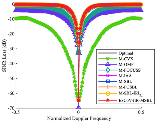 Next, the clutter suppression performance in the ideal case is considered. The SINR loss performance of the proposed algorithm is evaluated and compared with other state-of-the-art SR-STAP algorithms, including M-CVX, M-IAA, M-OMP, M-FOCUSS, M-SBL, M-FCSBL and M-SBL-IR. The number of i.i.d. training samples are set to be L = 9. Figure 4 depicts the curves of the SINR loss against the normalized Doppler frequency. As clearly illustrated in Figure 4, the proposed algorithm achieves the same near-optimal performance as M-IAA and the other three SBL based algorithms, revealing that the novel Bayesian probabilistic model proposed in this paper for STAP can accurately reconstruct the CNCM with a smaller parameter space. The performance of M-FOCUSS is found to be slightly inferior to theirs. Meanwhile, the proposed ExCoV-IIR-MSBL consumes the least running time among these three SBL based algorithms on this basis.
