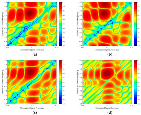 To more explicitly demonstrate the clutter suppression performance, Figure 5 plots the spatial-temporal adapted responses, given the STAP weight formed by the abovementioned algorithms. The presumed main lobe is located at a normalized spatial frequency of 0 with a normalized Doppler frequency of 0.2. From Figure 5, it is evident that the proposed method is able to maintain high gain at the presumed target location while precisely forming notches at the clutter ridge, suppressing both main lobe and sidelobe of the clutter component. Poorly performing algorithms have distorted two-dimensional responses and cannot accurately form notches at the clutter ridge.