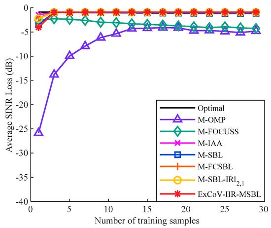 Note that because of the massive computational complexity of the M-CVX, it will not be discussed in the subsequent experiments. Then, Figure 6 illustrates the curves of the average SINR loss versus different a number of training samples. It should be noted that the average SINR loss is calculated by the mean of SINR loss for in this paper. As demonstrated in Figure 6, all algorithms have a certain degree of performance loss with one snapshot and increase with the number of training samples. ExCoV-IIR-MSBL apparently exhibits promising performance similar to the M-IAA and other SBL algorithms under small sample conditions. The proposed algorithm achieves a near-optimum performance with merely three training samples.