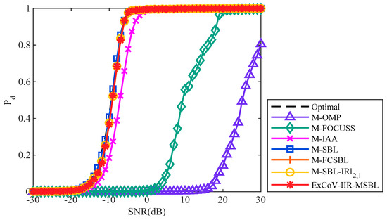Subsequently, we verify the target detection performance via the probability of detection (Pd) versus the target SNR curves, which are acquired by employing the cell-average constant false alarm rate (CA-CFAR) detector [37]. One hundred targets within the boresight are randomly added to the entire Range-Doppler plane, and the false alarm probability (Pfa) is fixed to 10−3. Figure 7 shows that the proposed algorithm and other SBL based algorithms have noticeable improvements compared to M-OMP and M-FOCUSS. This result indicates that the proposed algorithm has superior target detection performance.