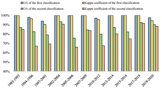 | Spectral feature | B1~B7, B10, NDVI, NDWI, NDSI, band difference, greenness, brightness, humidity, multi-temporal minimum band ratio |