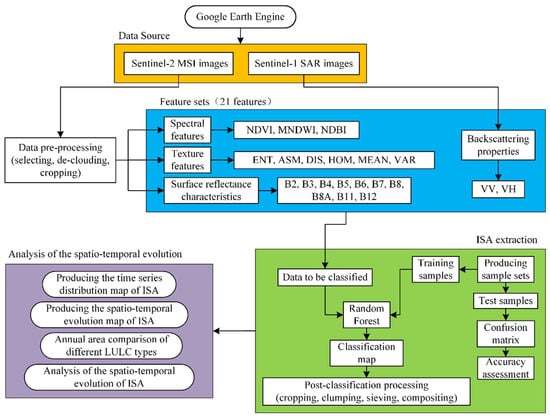 The ISA extraction based on multi-source and multi-modal Sentinel-1/2 imagery is illustrated in Figure 2 and mainly summarized in the following five steps. (i) Data pre-processing involves collecting Sentinel-1/2 images with less than 5% cloud coverage in the last 5 years and conducting cloud removal and cropping for the data; (ii) the building classification feature set involves (a) the extraction of 3 spectral indices (NDVI, NDBI, MNDWI) and 6 GLCM texture features with weak correlation using Sentinel-2 multispectral images, (b) the production of 2 backscattering coefficient features (VH and VV) from Sentinel-1 SAR images, and (c) combining Sentinel-2 surface reflectance features, spectral indices, backscattering coefficient, and GLCM textures to form feature set for classification (21 features). (iii) Collecting samples give a wide coverage of the study area, hence four representative areas are selected as the samples collection area, and the sample set is made by visual interpretation method combined with the historical images of the Map World. Subsequently, approximately 70% of the samples are randomly selected to construct the training set while the remaining samples constituted the test set. (iv) The ISA extraction and accuracy assessment: a random forest classifier was adopted for ISA extraction and a confusion matrix was utilized to test the accuracy of classification results. Five experiments based on different classifiers and different sets of features are also carried out for comparison to verify the superiority of the designed workflow. (v) For the spatial–temporal evolution analysis of the ISA, evolutionary mapping and an analysis on the ISA were conducted using time-series of the ISA in the YRDHEEZ over the past five years.
