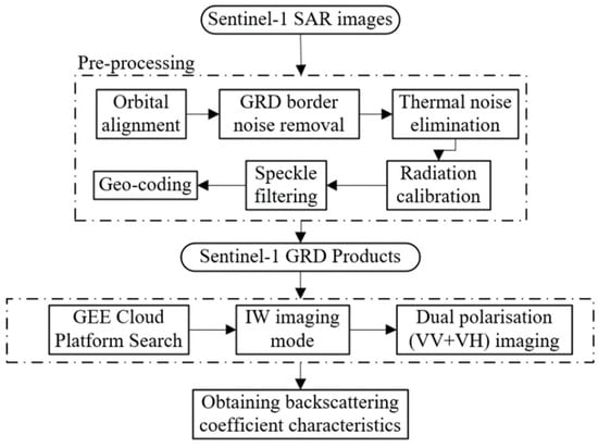 Previous studies have shown that the backscattering coefficient properties have a significant optimization effect on the ISA extraction []. In this study, the dual-polarized (VV + VH) bands in IW imaging mode are selected based on the Sentinel-1 GRD product, and the above two bands are used as the backscattering coefficient feature bands to improve the extraction of ISA. The calculation process of backscattering is shown in Figure 3.