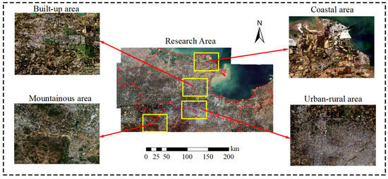 The YRDHEEZ occupied a vast area, so numerous Sentinel-1/2 images were required for covering it entirely. In order to reduce the data processing cycle and make full use of computer resources, four representative areas were selected for sample collection in this study. Figure 4 shows four representative sample areas (mountainous area, urban-rural combination area, built-up area and coastal area) selected from the images acquired on 2022.