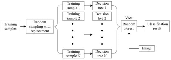 The random forest (RF) algorithm was proposed by Breiman in 2001 [], and the core of the RF is to create multitudes of decision trees that form the “forest” []. The principle of the RF is shown in Figure 5, and the detailed steps consist of the following four parts. (a) A randomly selected 2/3 of the samples with replacement are used to build N training sample sets, and the remaining 1/3 of the samples are used to test the performance of the corresponding decision trees, which is known as out-of-bag estimation (OOB) data. (b) N decision trees are built based on the training sample sets; (c) all nodes of the N decision trees utilize T features randomly selected from the classification feature set to carry out the split growth and select the optimal branch based on the principle of minimum Gini index []. (d) Based on ensemble learning theory to count the classification results predicted by each decision tree, the final land use/land cover type is determined by voting.