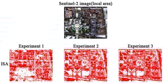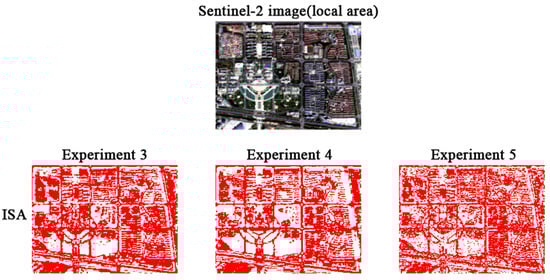 From Table 4, it can be observed that the accuracy of Experiment 1 is the lowest (with an overall accuracy of only 59.43% and a kappa coefficient of 0.5492) among all experiments when only backscattering coefficient features were used. According to Table 4, the overall accuracy of Experiment 3 is higher than that of Experiment 2 by about 2.5 percentage points, and the PA and UA of Experiment 3 is higher than that of Experiment 2 by about 5 to 6 percentage points. The inclusion of the backscattering coefficient features further improves the accuracy of ISA extraction. From Figure 6, the ISA is underestimated in both Experiment 1 and 2 while the result of Experiment 3 is in good agreement with the ISA real distribution. Through comprehensive analysis of the above three experiments, although the accuracy of classification only using SAR data is very low, it can be used as an effective supplementary of optical images to improve the quality of classification result.