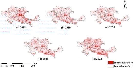 In order to explore the spatial–temporal evolution characteristics of ISA in the YRDHEEZ, the annual continuous time-series ISA data from 2018 to 2022 was produced using the proposed method. Table 6 shows the OA and Kappa of annual ISA result map in the YRDHEEZ. A high average OA (94.84%) and Kappa (0.9393) revealed that a series of promising ISA map was obtained, and it further demonstrated the effectiveness and advantage of the designed workflow in this study. Meanwhile, Table 6 also implied that the time-series classification result met the requirements for subsequent ISA evolution analysis.