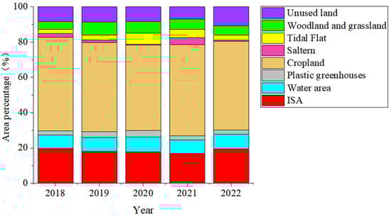 In order to compare the annual changes of land use/land cover types, a stacked bar (Figure 10) was made based on Table 7 for showing the area percentage of different land use/land cover types annually. From Figure 10, the area percentage of the ISA slightly decreases from 2018 to 2021 while a small increase of area percentage of the ISA occurred in 2022, which was related to a change in local government policies. Furthermore, unused land has a similar trend of change to the ISA. The change trend of woodland and grassland is different from that of the ISA, and the area of woodland and grassland gradually decreases from 2019. The change trend of the area of water, cropland, and plastic greenhouses is not obvious. On the whole, there is no great fluctuation for the area percentage of the annual ISA, which may be attributed to the short duration of the study period.