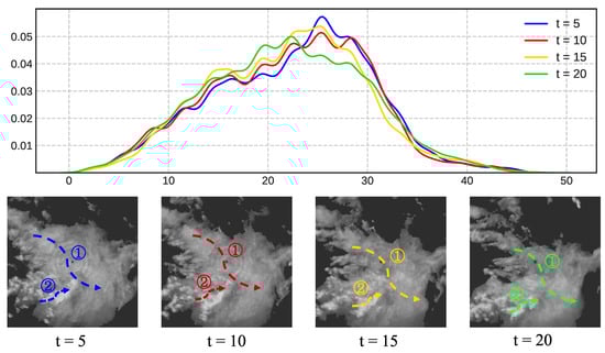 In Figure 1, the horizontal axis denotes the radar echo intensity (dBZ) and the vertical axis denotes the proportion of a certain echo’s intensity value and the distribution changes in a collection of typical spatiotemporal moving radar echo images at the fourth hour of 0.5, 1, 1.5, and 2 are shown. The echo value corresponding to the gradient augmentation and gradient weakening of the echo value distribution curve is comparable, and it is discovered that, with time, the echo value distribution of the radar echo images exhibits some regularity. Future spatiotemporal prediction may benefit if the historical spatiotemporal distribution data can be completely exploited. In addition, the model is inspired by MotionRNN’s concept of breaking down motion into trend motion and instantaneous motion [15]. As shown in Figure 1, curve ➀ describes the state of clouds with a huge physical space span during Doppler weather radar scanning, which this paper describes as a relatively large-scale spatial motion state. Curve ➁ describes the motion state of clouds with a small physical space span during Doppler weather radar scanning, which is described in this paper as a relatively tiny spatial scale motion state. It has been noted that the direction of a large-scale cloud cluster’s movement in an echo image typically correlates to the long-term movement trend and that this shift is frequently gradual and continuous. The instantaneous motion is equivalent to the violent and unstable creation and dissipation of and changes in tiny-scale clouds. To take into account changes in spatiotemporal motion states at multiple time scales and spatial scales, the model should dynamically construct multi-scale spatiotemporal motion states.