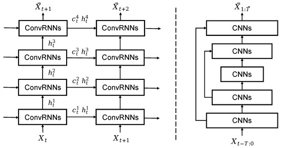 Currently, convolution-based recurrent neural networks and convolutional neural networks are the most widely used models for spatiotemporal prediction. The convolution-based recurrent neural network technique, as illustrated in the left part of Figure 2, typically uses LSTM as the core, with the input , the hidden unit , and the memory unit from the prior moment generating the output at the next moment. The efficiency of the overall model prediction process is determined by the input and output sequence length. Combining this fixed-order structure with convolution can effectively express spatiotemporal information since it has sufficient timing on its own. ConvLSTM [10], the first recurrent neural network based on convolutions, uses a convolution structure in place of LSTM’s fully connected structure to capture temporal and spatial information. Since the convolutional recursive structure in the model of ConvLSTM is position invariant, a trajectory GRU (TrajGRU) model was proposed [11], which can actively learn the position change structure of repeated connections. According to PredRNN [19], the memory state of spatiotemporal prediction learning should be remembered simultaneously in a single memory pool rather than being restricted to each LSTM unit as it currently is. As a result, a novel spatiotemporal LSTM (ST-LSTM) unit was developed, which can extract and recall both spatial and temporal information at the same time. Since then, a new phase of development for the convolution-based recurrent neural network has begun. To address the issue that gradient disappearance is likely to occur during the training of the PredRNN model, PredRNN++ [12] proposes to combine the Gradient Highway Unit (GHU) structure and the Causal LSTM structure connection. The spatiotemporal sequence information is made up of stationary and non-stationary information, according to MIM [20] analysis. Deep learning networks are excellent at predicting stationary data, but struggle to do so with non-stationary data due to their irregular nature. Afterward, MIM structures are stacked to mine high-order, non-stationary information. It is notable that deterministic terms, time-variable polynomials, and zero-mean random terms could all be used to deconstruct non-stationary information. E3D-LSTM [21] combines 3D convolution [22] and RNN to predict spatiotemporal sequences. SA-convlstm [23] was used to discover that the short-term local spatial information can only be effectively used by existing model methods, and the self-attention memory (SAM) was proposed based on the self-attention mechanism, which nested the current structure with SAM to obtain long-term global spatial information. CrevNet [24] uses reversible neural networks based on 3D convolution to encode and decode the input, with PredRNN serving as the prediction unit for spatiotemporal prediction. PredRNNv2 [25] asserts that a pair of memory units in PredRNN is redundant, proposes a memory decoupling loss function, and proposes a reverse sampling strategy to force the model to perform long-term spatiotemporal learning from the context framework. Movement in the real world may be separated into two types of movement: motion trends and transitory variations in space and time, which is something that MotionRNN takes into consideration [15]. On this basis, the modeling of motion trends and transient change using the MotionRNN model is presented. The aforementioned models, which are built on the convolution-based recurrent neural network, can only predict data once every time and cannot be trained and forecasted in parallel. As the duration of the prediction sequence increases, the total forecast impact will deviate due to the mistake in each individual prediction. However, past spatiotemporal information cannot be used to make predictions straight; rather, it can only be transformed into spatiotemporal properties that have a significant impact on future predictions by passing data between fixed-scale memory units at various times.