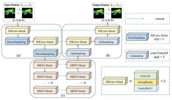 As shown in Figure 3, the overall model architecture proposed in this paper is expanded on the basis of the U-net structure, taking advantage of its solid performance in the field of spatiotemporal prediction. The structure of MSSTNet consists of an encoder and a decoder, just like the U-net structure. The distribution feature extraction module (a) and the motion feature extraction module (b) make up the encoder. To create the target sequence picture after decoding, the feature decoding module (c) integrates the features retrieved from (a) and (b).