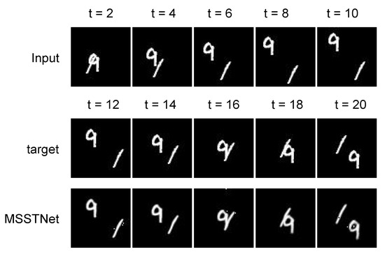 First, a quantitative analysis of MSSTNet was performed as shown in Table 5. The model presented in this paper outperformed CrevNet by in terms of the MSE index (MSE decreased from 22.3 to 21.4). The MSE was enhanced by almost as compared to the convolution-based recurrent neural network series model (MSE decreased from 48.4 to 21.4). The experimental results demonstrate that the proposed MSSTNet is able to predict future sequence images in the MovingMNIST dataset more accurately.