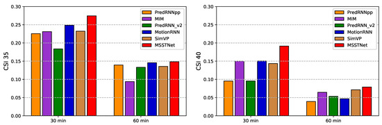 Figure 7 provides a quantitative comparison of the CSI index situations of radar echo intensity that are more likely to experience severe convective weather. The figure shows that the MSSTNet proposed in this paper has certain benefits over the previous state-of-the-art methods in forecasting the CSI score of the next 60 min, regardless of whether the radar echo intensity technique threshold is set at 35 dBZ and 40 dBZ. The MSSTNet model has much greater prediction accuracy than other models at 30 min, especially when the radar echo intensity threshold is 40 dBZ.