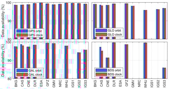 Figure 1 presents the epoch availability of SSR corrections; availability of orbit and clock corrections is given separately in consideration of the difference in the update interval for some ACs. The unhealthy satellites, which could be obtained from broadcast ephemeris, such as G11, G28, R11, E14 and E18 were excluded during the experiment. The epoch availability of GPS satellites from various ACs was more than 98.5%, and the highest availability of GPS corrections was from ESA and was 99.75%. For GLONASS, the products of WHU had the lowest epoch availability, at 95.79%, while GFZ had the highest epoch availability, at 99.37%. For Galileo, the epoch availability of IGS02 and IGS03 was obviously lower than other real-time products, and IGS02 had the lowest availability, at 94.20%. As for BDS, the epoch availability of DLR, GFZ and WHU was higher than 98.6%. The epoch availability of CAS and CNES were about 95.1% and 91.4%, respectively. However, IGS03 had the lowest epoch availability, at 85.9%, for the BDS constellation, which could have been due to discontinuities or outlier screening. Furthermore, the epoch availability of clock corrections was almost equal to the availability of orbit corrections for most SSR products as opposed to that of CAS, which showed that the clock corrections of Galileo and BDS from CAS may have more outages.
