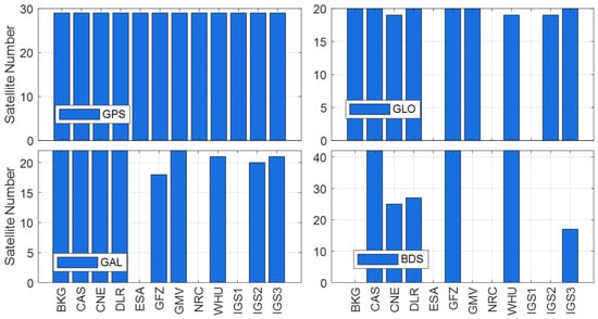 The number of available satellites per epoch for real-time products is given in Figure 2. There is little difference in the number of available GPS and GLONASS satellites among different SSR products, while the number of available GPS satellites was 29 for all real-time products in the test period. For GLONASS, the average number of available satellites from nine real-time products was 19 or 20. The significant inconsistency among real-time corrections is presented for Galileo and BDS. For most real-time corrections, the number of available Galileo was 22, while the SSR corrections from GFZ contain only 18 Galileo satellites. The SSR corrections of CAS, GFZ and WHU contained 42 BDS satellites, while the products of CNES, DLR and IGS03 contained 25, 27 and 17 BDS satellites, respectively. In general, the maturity of observation network determines the continuity and stability of SSR corrections. GPS satellites had the highest data availability for different SSR corrections; the next were GLONASS satellites, and the last were Galileo and BDS satellites.