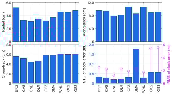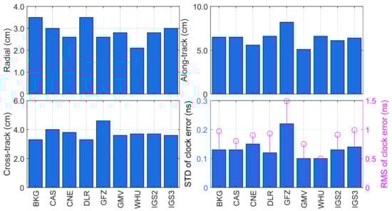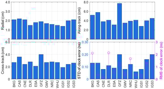 Figure 3 presents the accuracy of GPS SSR products. The radial component of all SSR products was generally better than 2.2 cm. The SSR products were better than 7.7 cm in the along-track and 4.0 cm in the cross-track component. IGS01 had the best performance for GPS orbit, i.e., 1.4, 2.8 and 1.9 cm in radial, along-track and cross-track components, respectively. The STD and RMS of clock errors from 12 SSR products also are shown in Figure 3. The mean STD of the clock errors for all GPS clock products was better than 0.2 ns. The clock corrections of WHU performed the best, with a mean STD of about 0.06 ns, which could be due to better consistency with the reference product. The clock products of CNES, ESA, GMV and IGS01 also achieved similar accuracy, which were better than 0.1 ns.