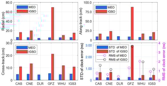 The accuracy of BDS SSR products. The STD (Left y axis and blue for MEO, red for IGSO) and RMS (Right y axis and magenta for MEO, black for IGSO) of clock errors is presented in the lower-right subplot.